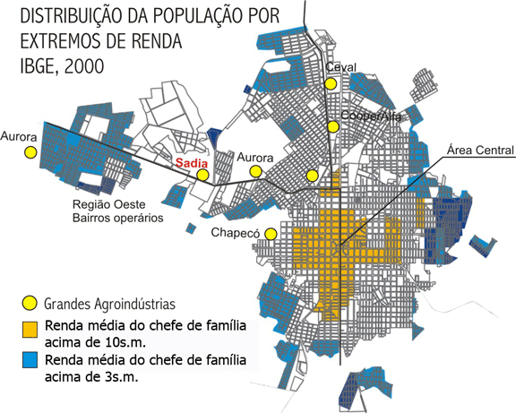 Concentração populacional de menor renda nas áreas próximas às agroindústrias (a oeste) en quanto as àreas centrais são ocupadas pelos