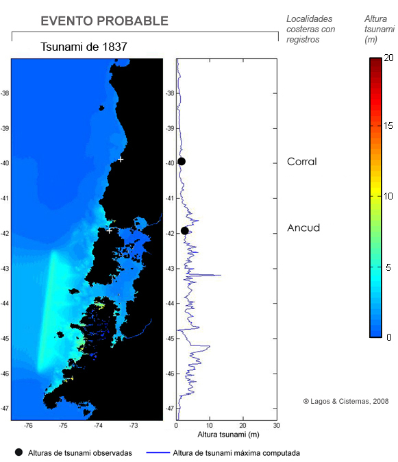 La figura 3 y 4 muestran el resultado de la modelación de ambos tsunamis frente a las costas del centro-sur de Chile. Para ello se utilizó el modelo japonés TUNAMI-N2[4]. Las alturas máximas de los tsunamis obtenidas por modelación, se validaron con alturas de olas observadas. Los resultados muestran claramente la superioridad del tsunami de 1960, alcanzando alturas máximas cercanas a los 20 metros. En tanto, el evento de 1837, en promedio no supera los 5 metros.