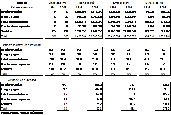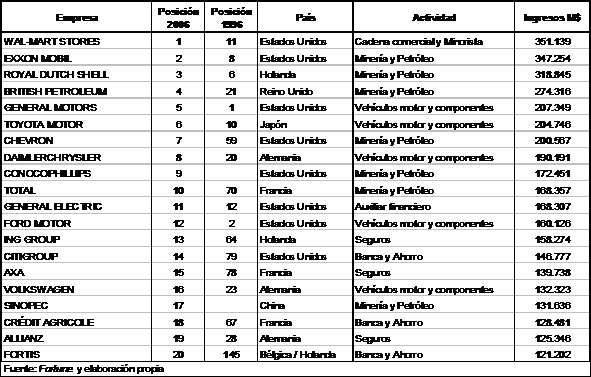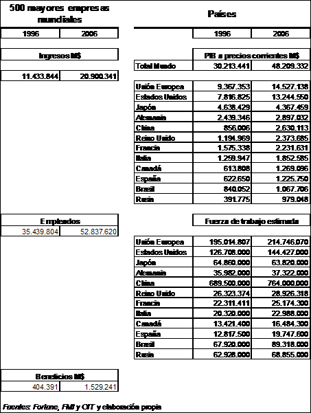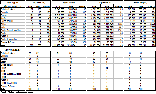 It is taken as it bases the 500 greater world-wide companies, carrying out comparisons between 1996 and 2006,analyzing its enterprise, sectorial and territorial structures, to reach to see the meaning of this enterprise power.
