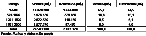 Cuadro 2. Distribución de las 2000 grandes empresas mundiales por rangos de concentración de actividad
