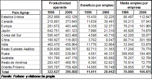 Diez años más tarde Corea del Sur se situaba en cabeza en productividad, mientras que el resto del conjunto asiático pierde en valores absolutos, al tiempo que Europa y en menor medida Estados Unidos, incrementan notablemente el factor productividad. China acompaña la tendencia a la baja de la productividad asiática, por cuanto desciende al valor más bajo de todos los conjuntos territoriales mundiales. Un caso particular es el representado por el área del Próximo Oriente por su vinculación al petróleo, pero se trata de una sola empresa.
