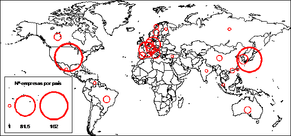 De hecho la presencia iberoamericana sólo se produce a través de dos países: Brasil, que mantiene 5 empresas y México, que pasa de 1 a 5. Mientras que desaparece la única empresa venezolana presente en 1996.