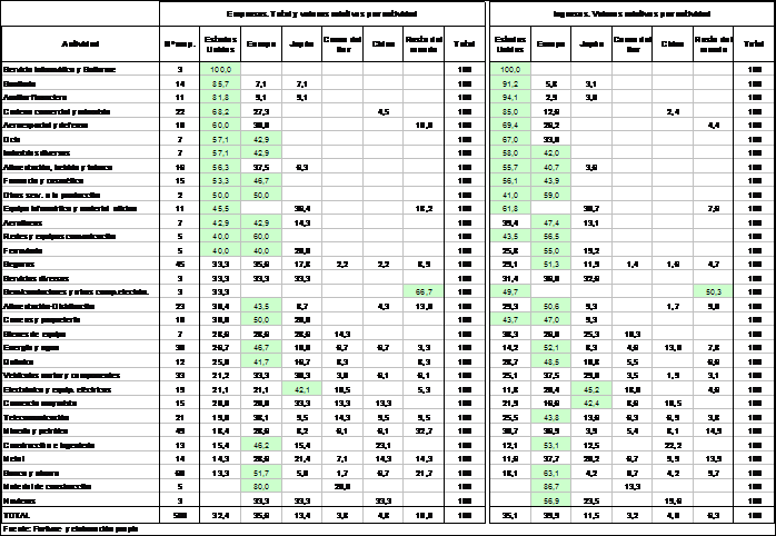 Japón, que en el año 2006 había descendido en su participación hasta el 13,4 por ciento de empresas y 11,5 por ciento de ingresos (desde el 25,2% y 29% respectivamente en 1996), continua manteniendo su potencia en Electrónica, Equipos informáticos o en el Comercio mayorista.