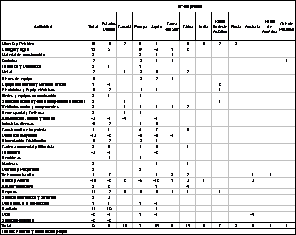 Estados Unidos se refuerza en los sectores Sanitario (10), Comercial minorista (5) y Energía y Agua (5).Mientras que pierde su mayor volumen de participación en el sector de las Telecomunicaciones (-7). Europa, por su parte, incrementa su peso en Energía y Agua (8), Minería y Petróleo (5) y Construcción e Ingeniería (4) y retrocede en Banca (-6) y Seguros (-5). Del resto del mundo cabe destacar el aumento de Seguros (3) en Canadá; también 3 nuevas empresas de telecomunicación en Corea del sur; así como también 3 nuevas empresas en cada uno de los sectores de Minería y Petróleo, Construcción e Ingeniería y Banca por parte de China; 4 empresas en Minería y Petróleo en India y 3 empresas en Banca en Australia. Por su parte, Rusia sólo incrementa su presencia en Minería y Petróleo, con 3 empresas.