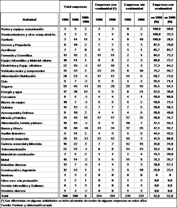 Para el caso español, 4 de las empresas de 1996 mantienen su presencia mientras que se incorporan 5 nuevas empresas. En estos diez años en España se ha vivido un fuerte proceso de privatización de las empresas nacionales, que en 1996 se reunían como holding formando el grupo TENEO, que ocupaba la posición 184 en 1996 y que en 2006 se había desmembrado.