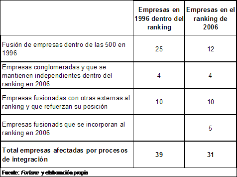 Ello significa que algunas de las empresas que no presentan continuidad se debe a que forman parte de fusiones entre empresas que formaban parte del ranking en 1996. De esta forma, 25 empresas de 1996 han quedado reducidas a 12 en 2006. Ello significa que han dejado 13 puestos libres para que pudiesen incorporarse nuevas empresas. En 4 casos, a pesar de haberse producido fusiones desde el punto de vista del control empresarial se han mantenido como empresas de gestión independiente dentro del ranking.