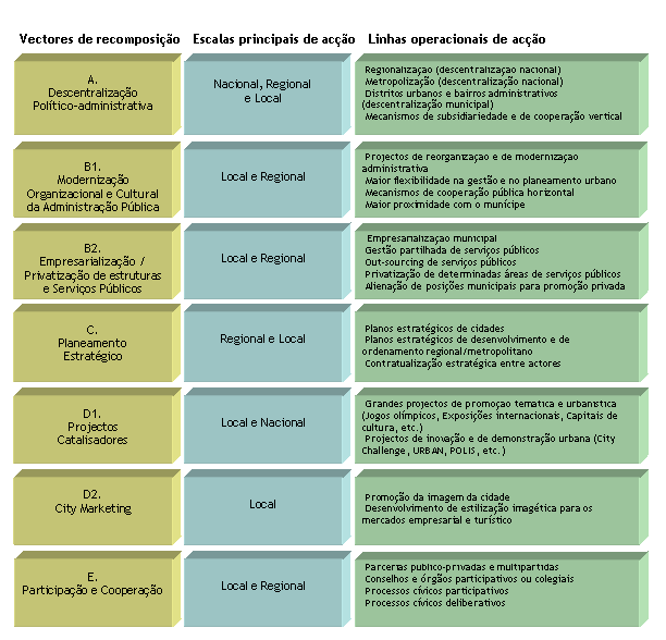 Nos anos mais recentes, uma miríade de processos, de iniciativas, de políticas, acções e programas tem sido desenvolvida, em variadas cidades e territórios urbanos, procurando dirigir-se, cada uma delas por formas mais ou menos inovadoras, para o atender das problemáticas e dos desafios com que se têm que defrontar, em distintas áreas e escalas: a abertura de novas áreas e de novas dimensões de actuação pública e cívica sobre a cidade; o reordenamento institucional de estruturas de responsabilização e de accountability; processos de planeamento urbano e de planeamento estratégico, a várias escalas, por formas social e civicamente mais envolventes e mais co-responsabilizantes; a descentralização de responsabilidades, políticas e programas; o redesenho e reorientação de estruturas normativas e jurídicas; processos de reflexão e de decisão política mais participativos ou mesmo deliberativos; novas experiências de responsabilização comunitária.