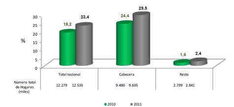En el caso colombiano, según el boletín de prensa de Indicadores Básicos de Tecnologías de Información y Comunicación para el año 2011 del DANE, en Colombia el porcentaje de hogares en Colombia que poseían computador era de 29% y los hogares que tenían conexión a internet era de un 23.4%; como se puede observar en la siguiente gráfica, que hace una comparación con el año anterior, lo que nos afirma que el uso de estas tecnologías se está incrementado en Colombia.