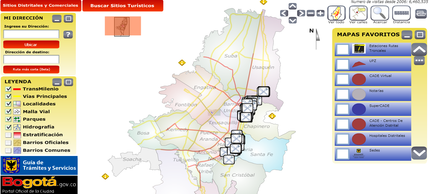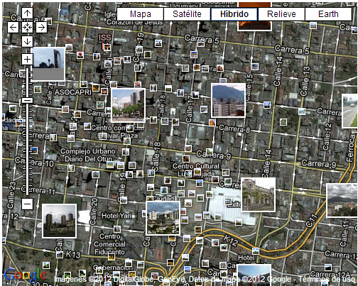 El mapa tiene fotografías las cuales al seleccionar se despliegan, además por basarse en un mapa Google Maps, hay nombres de las vías y barrios de la ciudad. |