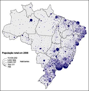Figura 2. Exemplo de delimitação do urbano e do rural, segundo o critério do patamar demográfico.Fonte: Girardi, 2008 |