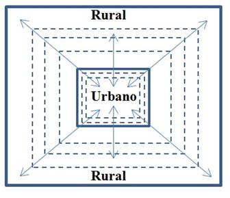 A noção do continuum implica considerar a existência de uma graduação entre o urbano e o rural, de modo que pode-se identificar diferentes níveis escalares de relações urbanas ou rurais, os quais seriam níveis de transição entre os extremos urbano e rural (figura 6).