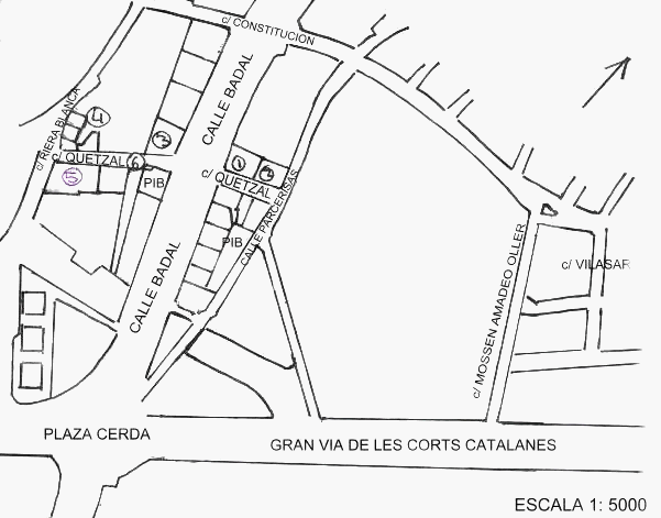 27. La apertura de la calle Quetzal estaba incluida en el Proyecto de Urbanización de la zona limitada por la Avenida José Antonio Primo de Rivera, calle Vilasar, calle Constitución y calle Riera Blanca (término municipal de Hospitalet del Llobregat). Destacar que dicho proyecto preveía la apertura de la calle quetzal hasta la calle Mossèn Amadeo Oller, y que el tramo entre ésta y la calle Parcerisas aún no se ha llevado a cabo. Ver Archivo Municipal Administrativo de Barcelona. Ayuntamiento de Barcelona. Sección de Obras Públicas, Negociado de Urbanización y Reconstrucción, exp. nº 175, año 1939.