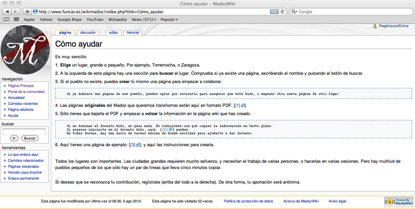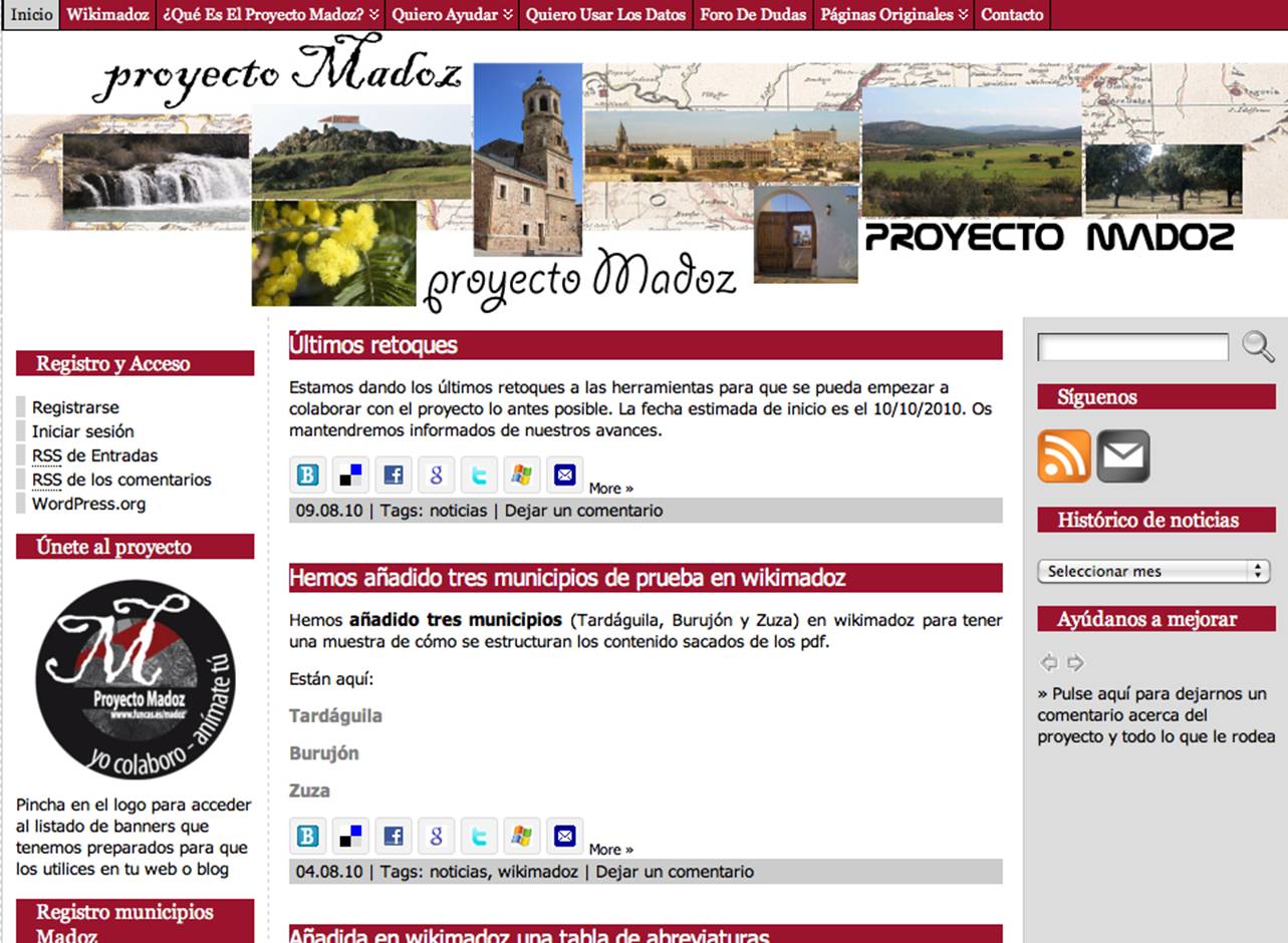 Para abordar la tarea de restauración, consistente en teclear con cuidado 10.456 páginas escaneadas, llenas de abreviaturas y no siempre cómodas de leer, es imprescindible contar con una red social de voluntarios. No deja de resultar curioso el paralelismo entre este proceder y el de Madoz en su tiempo, cuando decía en la introducción de su obra (vol I, p VIII) que había tres maneras de realizar el ambicioso trabajo que tenía en mente: recorrer toda España aldea por aldea; encargar a personas ilustradas que le proporcionaran la información por un precio; o contar con una legión de voluntarios que le fueran mandando notas e informes. Decía él que la primera opción no era factible para una persona; que la segunda tampoco, proviniendo él de familia humilde, y que sólo le quedaba la tercera. Afirmaba también Madoz que parecía haber gastos más prioritarios para el Estado[9]. Ciento sesenta años después, la situación es exactamente la misma.