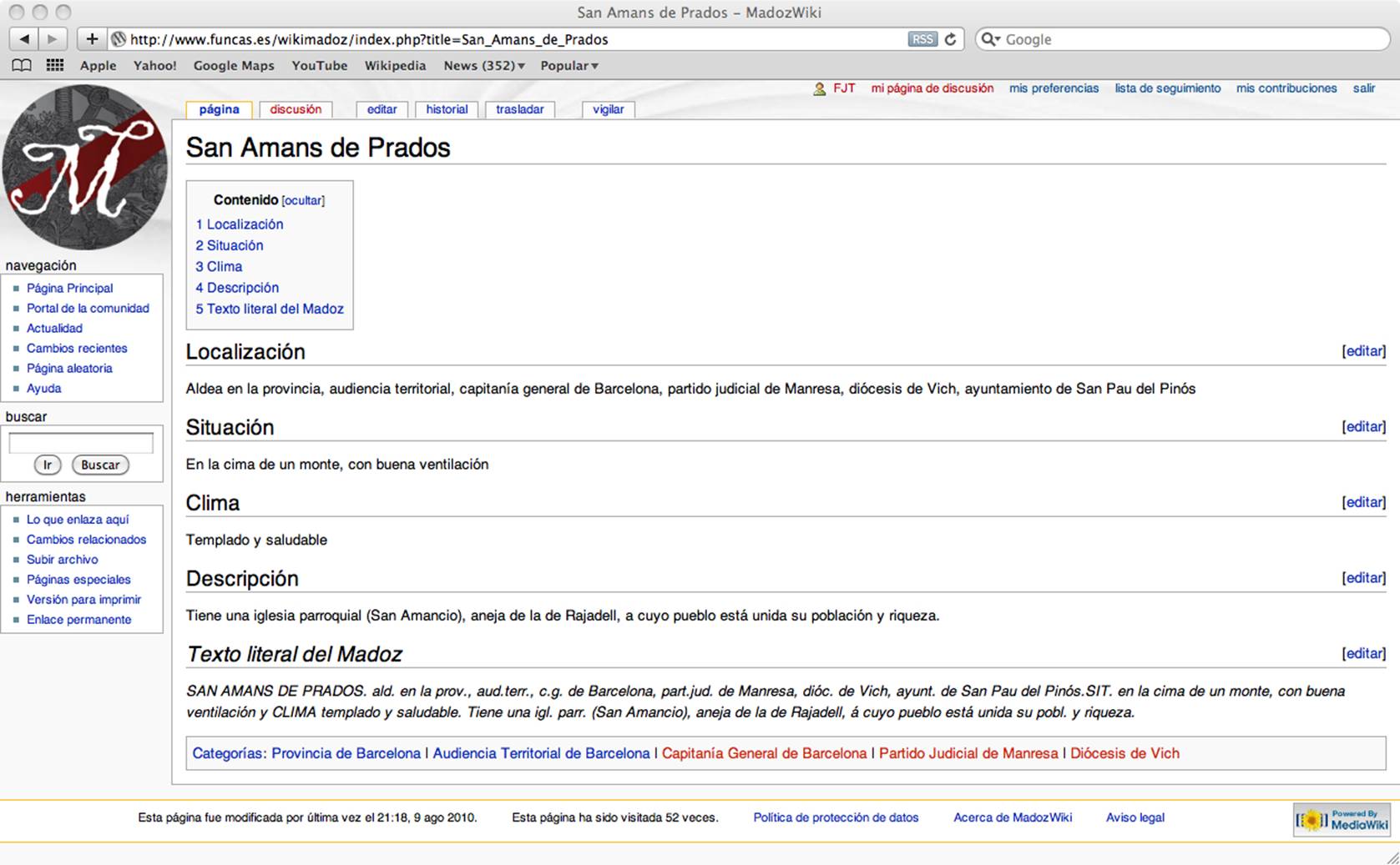 TAPIADOR, Francisco J.; MEZO, Josu; NAVARRO, Andrés. El 'Proyecto Madoz' La reconstrucción del diccionario de Madoz en la Web 2.0. Biblio 3W. Revista Bibliográfica de Geografía y Ciencias Sociales. [En línea]. Barcelona: Universidad de Barcelona, Vol. XV, nº 916, 25 de marzo de 2011. <http://www.ub.es/geocrit/b3w-916.htm>. [ISSN 1138-9796].