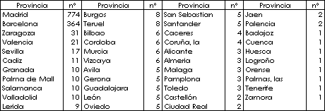 El estudio de los centros de edición también revela la escasa descentralización de la actividad editorial en España. En la gran mayoría de provincias la edición se concentró en la capital, único núcleo urbano de importancia en un territorio eminentemente agrícola. No obstante, doce provincias acogieron más de un centro editor. En siete de ellas contaron con dos sedes, aunque en Gijón, Jativa y Calatayud sólo se publicaron almanaques. Y en Cartagena y Sestao fue la presencia de una empresa industrial importante la causa de estas publicaciones, mientras que en Tortosa fue el Observatorio Físico Cósmico del Ebro la explicación. Por otra parte, aunque Madríd contó con tres sedes editoriales, su grado de descentralización no es mayor, pues en Alcalá sólo se coeditó con Madrid una revista. En cambio si es significativa la descentralización de la actividad editorial en La Coruña y Cádiz entre las ciudades que aún en la actualidad se reparten la actividad y, sobre todo, en las Baleares donde hoy existe un mayor grado de centralización. Finalmente, Barcelona fue la provincia más descentralizada, ocho ciudades fueron sede de al menos una publicación especializada, reflejo de su estructura urbana y económica.