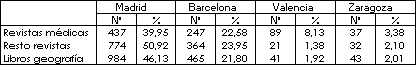 En comparación con el conjunto de las revistas médicas, se nota la ausencia de centros editores secundarios, que reunan en torno al diez por ciento de las publicaciones, como sucede con Valencia para las revistas médicas. Los datos referentes a otra actividad editorial, en este caso la publicación de libros de geografía, nos permite indicar la ausencia de un centro editorial de menor importancia que Barcelona, pero de mayor importancia que los restantes centros terciarios. Sin lugar a dudas el papel destacado de Valencia en cuanto a las revistas médicas denota la importancia de su Universidad en este campo.