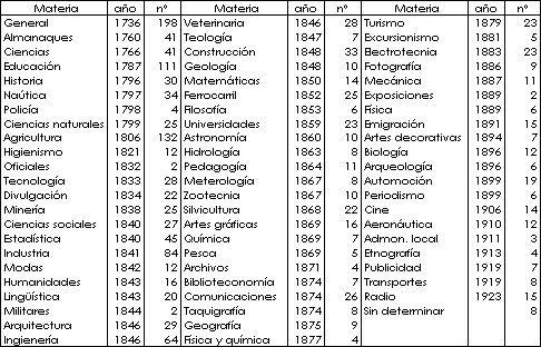 Existen, sin duda alguna, importantes sombras regionales que con el tiempo y nuevas colaboraciones será posible subsanar. Aún así, el análisis de los directorios de las bibliotecas más importantes de Madrid donde han sido depositadas un elevadísimo porcentaje de las publicaciones editadas en otras poblaciones. y el estudio de los catálogos de la totalidad de las bibliotecas catalanas, segunda área editorial del Estado, además, de las relaciones de la Asociación de la Prensa Técnica de España nos permite realizar esta primera aproximación. Creemos que las 1.520 publicaciones que quedan relacionadas en nuestra base de datos permiten comenzar a realizar unas primeras valoraciones sobre el panorama editorial de la época.