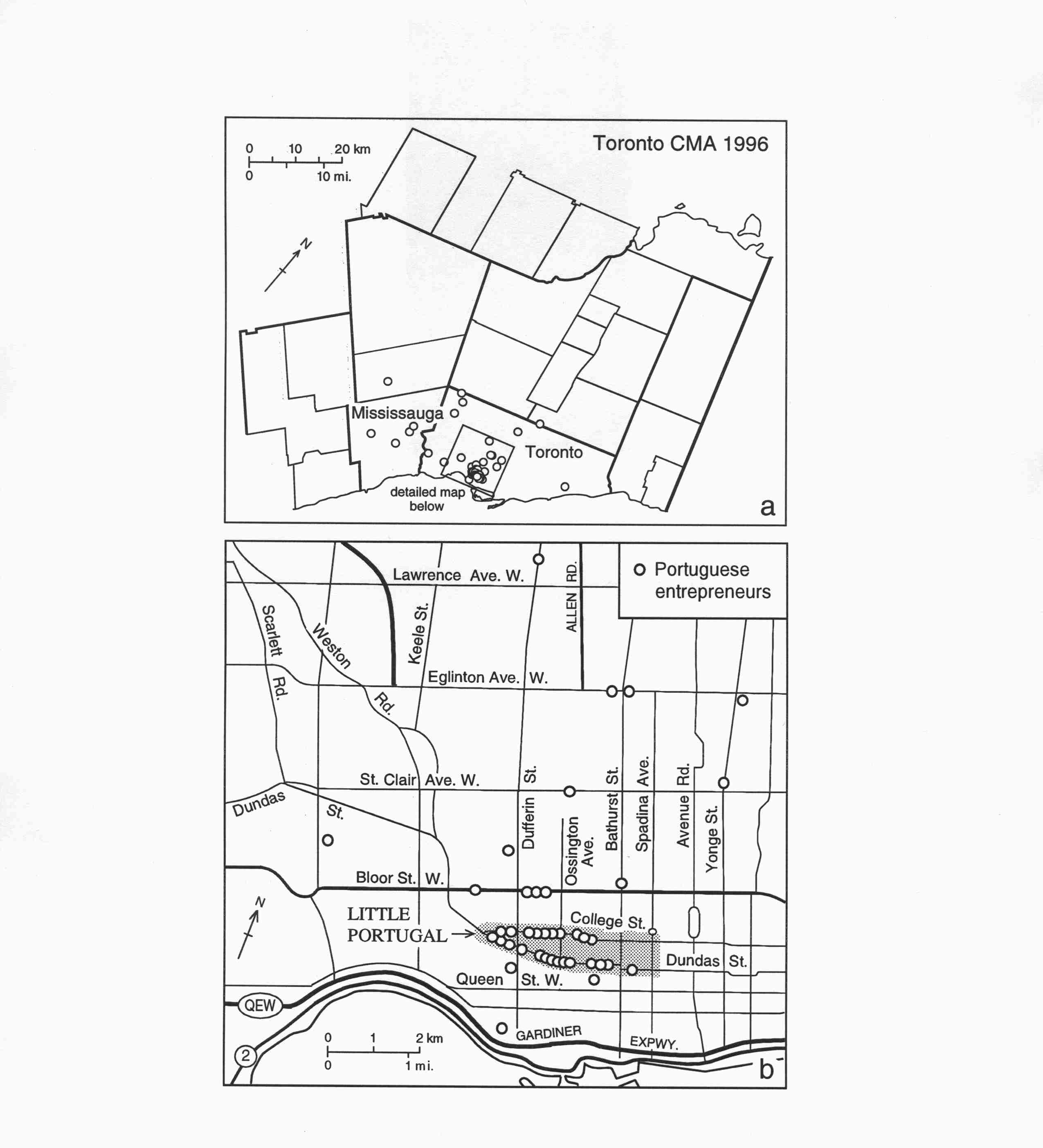 Considerando que o grupo português é um dos grupos mais concentrados em Toronto, não é surpreendente que a proximidade com a comunidade portuguesa se tornou uma prioridade para este grupo de empresários. As análises também indicam que os negócios de portugueses são pequenos e familiarmente orientados. Também se confia extensivamente nos sócios familiares e empregados portugueses para dirigir o negócio. O conhecimento do idioma português, a familiaridade com as necessidades e preferências dos clientes portugueses e a relação “co-étnica” de “confiança” que eles estabelecem com os clientes portugueses, eram reconhecidos por empresários portugueses como vantagens principais de ter os empregados da mesma origem étnica.