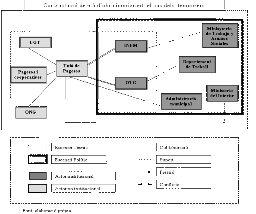 Un cop vistos tots els actors relacionats amb la política de contractació de mà d'obra temporal, podem comprovar en un mapa d'interacció d'actors com aquesta iniciativa quedaria fora de l'escenari polític, ja que l'actor principal i promotor és Unió de Pagesos.(figura 4)