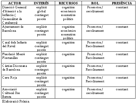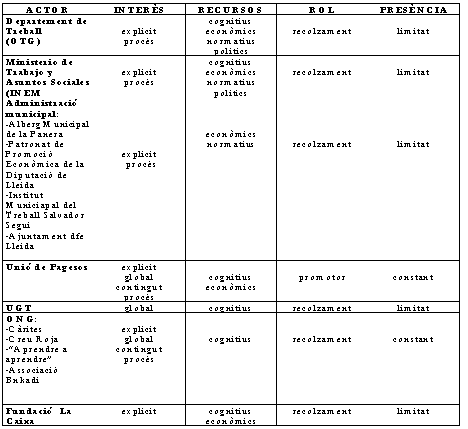 En aquest procés ens ha semblat bàsic identificar el conjunt d'agents que intervenen i interactuen. Els actors tenen les seves pròpies lògiques, la qual cosa fa que dins de l'anàlisi de polítiques públiques es consideri que els seus objectius no sempre són clars i explícits. El seu comportament, en canvi , és racional respecte a les oportunitats i respecte al context en que es veuen immersos, i també, d'altra banda, respecte al comportament de la resta d'actors. Per tant es pot definir el marc en el que es mouen com un marc d'interacció estratègica (1). (quadre 1 i figures 1, 2 i 3)