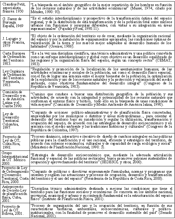 Por tratarse de un tema incipiente en el contexto latinoamericano, es casi obligado iniciar su examen con un intento por escudriñar la esencia del mismo, a partir de la revisión de distintos conceptos y definiciones que se han dado. En este sentido, podemos afirmar que la ordenación del territorio ha sido objeto de diversas interpretaciones en el mundo. Un vistazo al cuadro 1 nos permite confirmar dicha aseveración. En ella se reúne una muestra de definiciones adoptadas en algunos países europeos y latinoamericanos, las cuales expresan distintas maneras de entender la naturaleza y objeto de la ordenación.