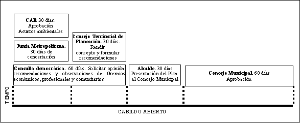 Colombia es, quizás, el país donde la normatividad establece unas condiciones favorables para una participación ciudadana más proactiva. Según la Ley de Desarrollo Territorial los planes municipales y distritales deben ser el resultado de un proceso de discusión y concertación con los actores sociales del municipio, en todas sus etapas: preliminar, diagnóstico, formulación, aprobación y ejecución. Dicha Ley y normas reglamentarias posteriores establecen distintos mecanismos de participación para cada etapa. Se destacan las audiencias públicas y cabildos abiertos, así como las mesas de concertación y los comités de seguimiento (Congreso de la República de Colombia, 1997). Del mismo modo, la Constitución Política (CP) de 1991 ha puesto a disposición de la comunidad instrumentos tales como el Derecho de Petición[10], la Revocatoria del Mandato[11], la Acción de Grupo[12], las veedurías ciudadanas[13], la Acción de tutela[14] y la Acción de Cumplimiento[15], mediante los cuales, los ciudadanos podrán exigir el cumplimiento de los planes o el respeto a sus derechos, si considera que las autoridades están haciendo caso omiso del mismo o si se está violando alguno de sus derechos. Además de la concertación con los actores sociales, los planes municipales de OT de Colombia deben ser aprobados por las corporaciones regionales de desarrollo (autoridad ambiental), por el consejo de planificación, por el concejo municipal y por la junta metropolitana[16] (figura 2).