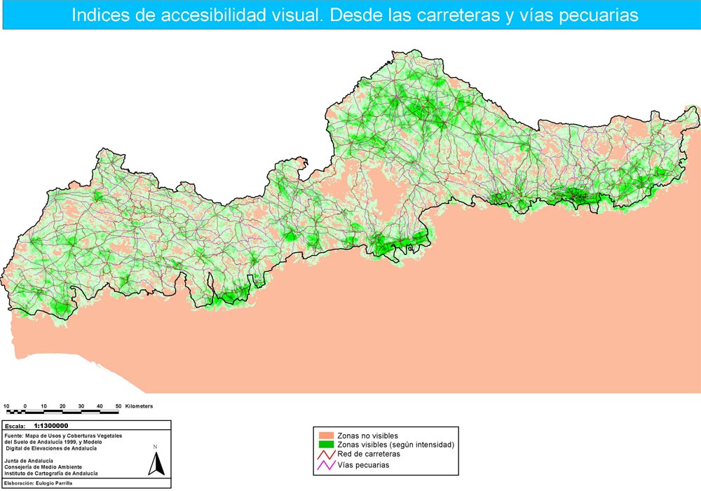 El análisis de tales factores (relieves, vías de acceso, núcleos poblacionales, belvederes u oteros, estructura catastral…) puede conducir a un índice complejo de accesibilidad visual a los paisajes, que -apoyado en un Sistema de Información Geográfica que permita relacionar el modelo digital de altitudes con la existencia de vías de comunicación y de núcleos poblacionales- conduzca –por ejemplo- a los siguientes mapas, que muestran la accesibilidad visual de los distintos paisajes de Sierra Morena desde sus propios núcleos poblacionales y desde sus carreteras y caminos más concurridos.