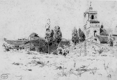 | Figuras 6 y 7. E. Sánchez Perrier: Iglesia y cementerio de Fuenteheridos, 1879; E. Sánchez Perrier: Cercados de Constantina al atardecer,1893. | |