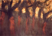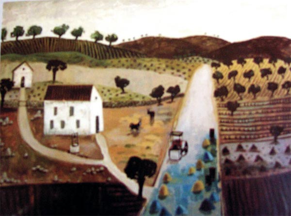 Pilar Molinos, creadora serrana de la Extremadura mariánica –Fregenal de la Sierra- vive, escribe y pinta en su serranía. Su pintura es la expresión de un mundo personal de carácter mágico simbólico, en el que lo ancestral, que lleva dentro, aflora con formas orgánicas, geométricas y esenciales, conectando con el espectador de manera directa, desde la emoción y los sueños. Evocadora del vanguardismo español de los años treinta (Benjamín Palacios u Ortega Muñoz, denominados “fauvistas telúricos” por Gaya Nuño), la pintura de Pilar Molinos es transparente, libre y despreocupada por lo que podrían considerarse valores convencionales de la representación plástica (Pajuelo, J.L., 1993). Desde una posición personal y aniñada, desvirtúa la realidad y concentra su particular universo en una figuración entre sorprendida y vivaz a través de unos paisajes con emoción incorporada en los que, casi siempre y voluntariamente, se evocan mundos infantiles (Barco, P. del, 1993). Pero como la de los auténticos creadores, la trayectoria de Pilar Molinos muestra una constante búsqueda en los márgenes de una figuración para conseguir ese camino de despojamiento que le conduzca hasta elementos simbólicos neutros, formas últimas, signos definitivos (Tajan, A., 1998).