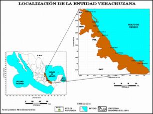El estado de Veracruz de Ignacio de la Llave colinda al norte con Tamaulipas y el Golfo de México; al este con el Golfo de México, Tabasco y Chiapas; al sur con Chiapas y Oaxaca; al oeste con Puebla, Hidalgo y San Luis Potosí (véase figura 1). La entidad veracruzana se localiza entre las siguientes coordenadas geográficas: al norte 22°28', al sur 17°09' de latitud norte; al este 93°36' y al oeste 98°39' de longitud oeste. El estado se localiza en la región económica Oriente y representa el 3.7% de la superficie del país.