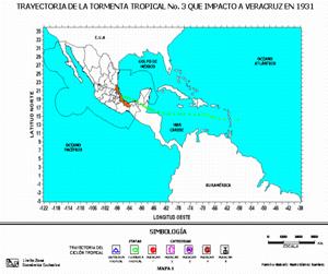 En el año de 1931 se formaron 3 ciclones tropicales que impactaron al territorio veracruzano. En agosto se formo una tormenta tropical la # 3 y en septiembre 2 huracanes el # 5 y # 6. Este último inició el 8 de septiembre culminó el 16, con categoría de huracán 2 y “provocó inundaciones en la cuenca del Papaloapan” (Luna, 1984, pp. 26-31) (véase figura 1 y cuadro 1).