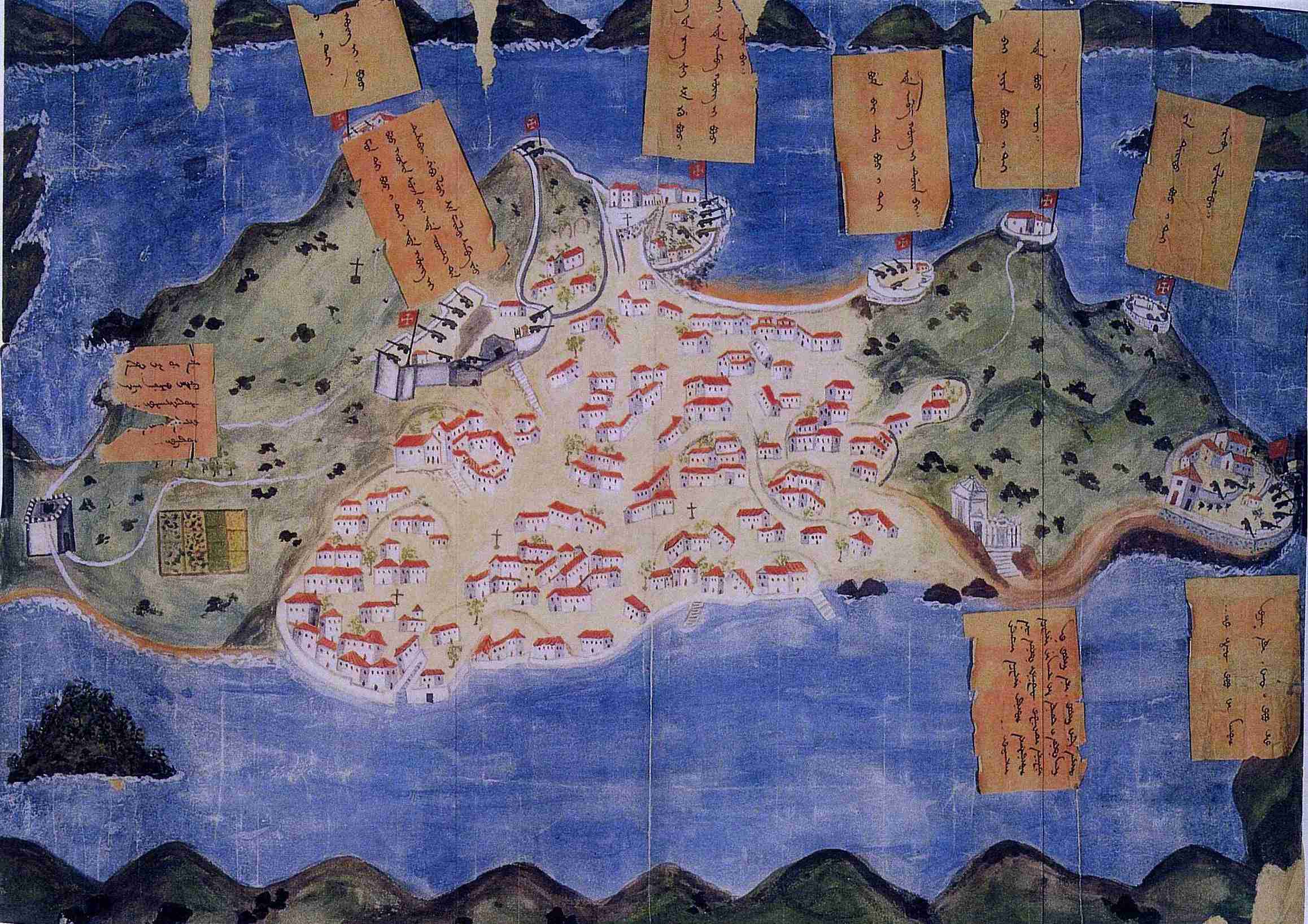 Olhando o panorama do casario – de um imaculado branco mediterrânico – que a primeira destas imagens oferece, detecta-se que tal representação está mais próxima do traço original de Barreto de Resende do que de qualquer uma das posteriores simplificações do respectivo modelo já descritas (figura 3). As principais diferenças face a esse mesmo modelo de partida traduzem-se no acrescento de alguns perímetros amuralhados e na supressão de outros, numa maior precisão do risco da maioria das fortalezas e peças de artilharia, nas bandeiras com a cruz de Cristo levantadas dentro dessas fortalezas e na aparente ausência da silhueta de qualquer navio – dizemos aparente porque alguma ou algumas das nove grandes legendas em manchu que, manifestamente, foram acrescentadas ao desenho poderá ter ocultado o bosquejo de uma ou mais embarcações. A propósito destas 9 legendas, importa ainda notar que assinalam as 7 baterias e fortalezas principais, as Portas do Cerco e o templo de A-Má. Com excepção daquela que se reporta a estes dois últimos sítios, a informação nelas contida respeita apenas a matéria militar, designadamente ao número e à qualidade das peças de artilharia[20] .