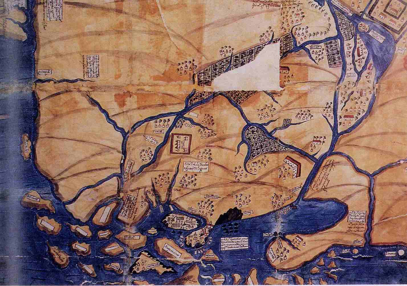 um denso arvoredo e o istmo, marca ainda algumas casas, representando a aldeia