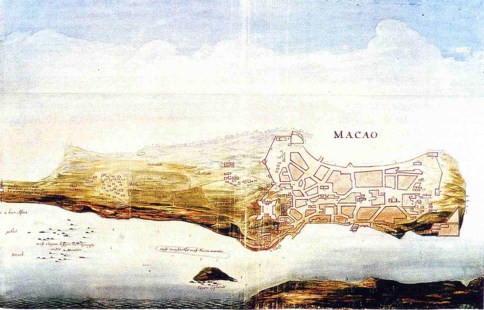 Se exceptuarmos os múltiplos elementos sobre a ocupação do sítio facultados pela documentação escrita que foi sendo produzida desde os primórdios da presença portuguesa em Macau, é possível que a mais antiga sugestão visual individualizada e não fantasiosa da península de Macau de que há notícia seja um desenho saído da mão de outro cartógrafo luso-asiático, Manuel Godinho de Erédia (figura 1). Trata-se do esboço incluído num atlas-miscelânea de c. 1615-c. 1622, que pertenceu à colecção de Carlos M. Machado Figueira (Lisboa), mas cujo paradeiro se desconhece. Este esboço tanto poderá ter sido cópia de um mapa existente em Goa, como de um protótipo cedido a Erédia por alguém que conhecesse o terreno[3] .