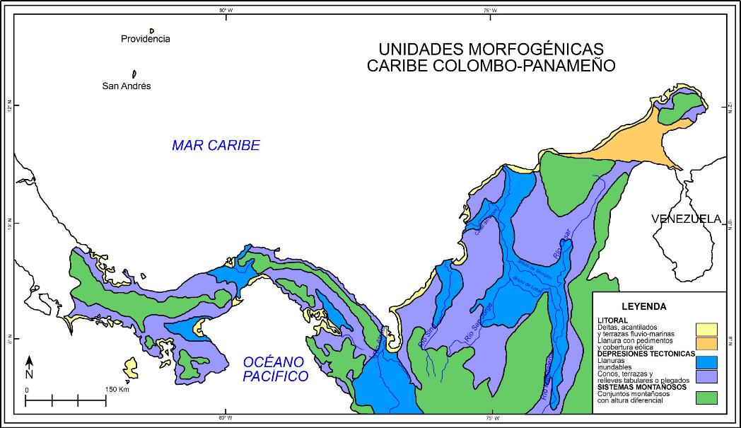 Las formas de ocupación del territorio están íntimamente ligadas a la expresión superficial del modelado de la Tierra, es decir, a su geomorfología. Con lo anterior de ninguna manera se pretende plantear determinismos que vinculen linealmente formas de organización social, y sobre todo comportamientos humanos, con elementos físicos, pero sí se sugiere que la organización territorial está en gran medida ligada a las características físicas de la superficie terrestre, especialmente desde la perspectiva de la oferta ambiental y los consecuentes usos. Con el fin de distinguir los principales rasgos de la conformación física del Caribe Granadino -en la actualidad Colombia y Panamá-, se adoptó la perspectiva de sistemas morfogénicos que propone el Instituto de Estudios Ambientales (IDEAM) de Colombia y Antonio Flórez[2], incluyendo las unidades morfogénicas y los conjuntos de geoformas asociadas; esta información se complementó puntualmente con otras fuentes[3]. Para el caso de Panamá, que posee una historia geológica un tanto diferente a la actual Colombia[4], se realizó una adaptación de estas grandes unidades, con el objetivo de realizar una zonificación conjunta que permitiera manejar, en la medida de lo posible, niveles de información compatibles[5].