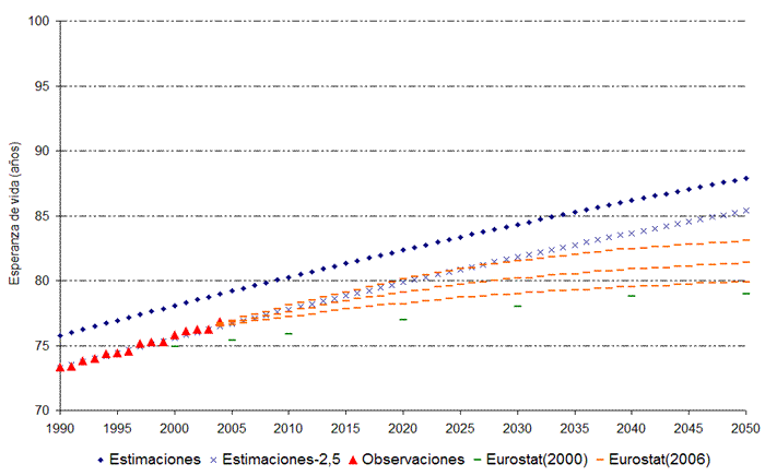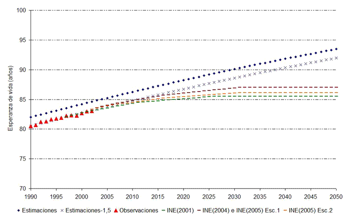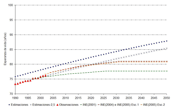Los valores así obtenidos para el caso español (85,38 años para los hombres y 91,97 para las mujeres en 2050) superan ampliamente a los propuestos por el INE (81 y 87 años, respectivamente) o por Eurostat (83,1 y 89,2 en su escenario más favorable). Esto es debido a que, probablemente, las proyecciones de estos organismos estén subestimando de forma sistemática las posibilidades de crecimiento de la esperanza de vida, de manera especial a largo plazo, donde la longevidad media según sus previsiones apenas aumenta, algo que no encuentra justificación ni en la dinámica pasada de las series ni en la capacidad de adopción de costumbres más sanas o de mejora de la medicina que aún parece existir. La continua corrección al alza de las cifras de esperanza de vida que estos organismos utilizan en sus proyecciones refuerza esta intuición.