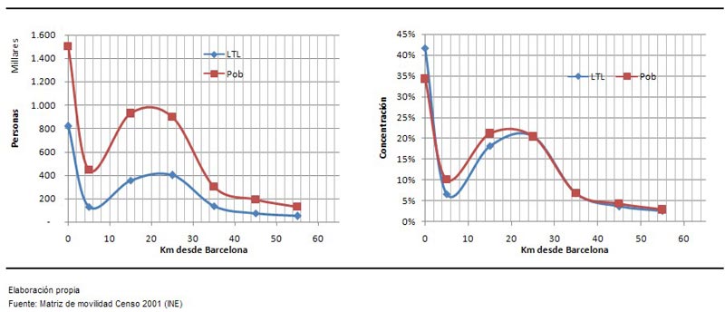 Si la información se resume agrupando los municipios en coronas isodistantes mediante la distancia que separa a cada localidad de Barcelona por carretera[4] se obtiene la imagen sintética de la figura 3. Así, gráficamente se aprecia que la distribución metropolitana del empleo está caracterizada por una curva de dos “jorobas” que representan, por una parte, a Barcelona y, por otra, al conjunto de municipios importantes del Arco Metropolitano (ubicados entre los 10 y 30 Km desde Barcelona). La figura 3 también permite comparar la distribución espacial de la actividad económica con la distribución de la población, el gráfico de la derecha, construido con datos relativos, desvela la mayor centralidad en la concentración económica en relación a la demográfica. Como se ha dicho Barcelona concentra el 42% de los LTL, sin embargo apenas tiene el 34% de la población, por otra parte los municipios del entorno de Barcelona, consolidados durante la inmigración de las décadas de 1960 y 1970 (ubicados a menos de 10 Km), tienen una presencia demográfica superior a la presencia de la actividad económica, denotando, de esta manera el carácter de “ciudades dormitorio”. El balance demográfico-económico alcanza un punto de equilibrio en la franja territorial ubicada entre los 20 y 30 Km, es decir en la corona que alberga a las ciudades maduras del Arco Metropolitano (Sabadell -22 Km-, Terrassa -28 Km-, Mataró -30 Km- y por poco Granollers -30,04 Km-). A partir de ese punto la presencia de población es mayor que no la de la actividad económica.