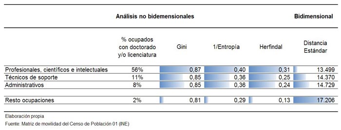 La tabla 3 detalla los patrones locativos de las tres últimas categorías del empleo[9], a grandes rasgos se observa que las actividades de la información más cualificadas se encuentran sensiblemente más concentradas que el resto de actividades. Sin embargo, los indicadores que caracterizan las tendencias locativas de los técnicos de soporte y de los administrativos son muy similares, estando estos últimos ligeramente más periféricos, desconcentrados y dispersos.