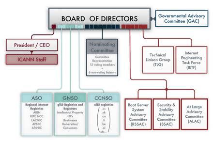 Por isso, embora aparentemente a ICANN seja uma empresa sem fins lucrativos, ela está de fato assegurando o total controle político-econômico da Internet pelos EUA, através de sua estrutura organizacional (figura 2) de gestão que envolve um conjunto de várias instituições e comitês.