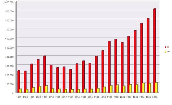 Figura 1. Viviendas en proyectos visados (EE = Estado Español, PV = País Valenciano)