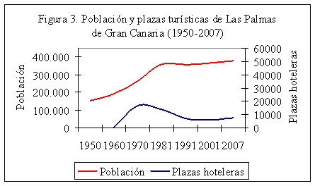 c. La dimensión de la especialización turística fue mayor, más temprana y más duradera en Palma, pues se inició a principios de los cincuenta y el número de plazas alcanzó la cifra de 60.000 hacia 1981, mientras que en Las Palmas se originó hacia fines de la misma década y rondó el máximo de 33.000 hacia 1972. De esta diferencia deriva la mayor dificultad que presentan los enclaves turísticos de Palma frente a los de Las Palmas ante la reconversión.