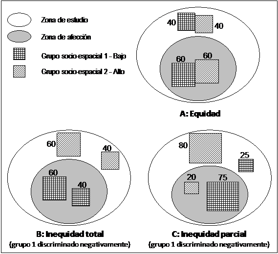 La expresión, que es sólo una aproximación necesitada de concreción ulterior, intenta reflejar en qué medida la relación entre perjuicios y beneficios ambientales percibidos durante un período estándar k por un grupo determinado i sito en un lugar j es similar a la que existe en toda la zona para el conjunto de los grupos. El índice se referiría a cada subzona y grupo. La situación teóricamente justa vendría dada por cocientes unitarios; las desviaciones respecto a la unidad marcarían inequidad, bien por discriminación negativa (εijk > 1), bien positiva (εijk < 1). La comparación cuantitativa o cartográfica entre los εijk permitiría apreciar las inequidades entre grupos en el espacio.