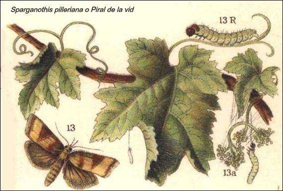 La piral (Sparganothis pilleriana) era y es conocida también como palomilla de la vid, pajuela, oruga de rebujo, gusarapo, lagarta, cuc vert, etc. El agente reproductor es una palomilla de 1 a 1’5 cm de largo que en el mes de julio incuba unas larvas que dan lugar a gusanos que se ocultan en las cortezas de la cepas, donde forman un capullo sedoso y pasan así hasta la primavera siguiente en la que, coincidiendo con la brotación de la vid salen de su letargo y se instalan en las yemas donde tejen con hilos de seda unas mallas o nidos que rodean los bordes doblados de las hojas, alimentándose de las flores e incluso racimos ya formados, provocando una reducción de la cosecha que puede llegar a ser muy grande (figura 1).