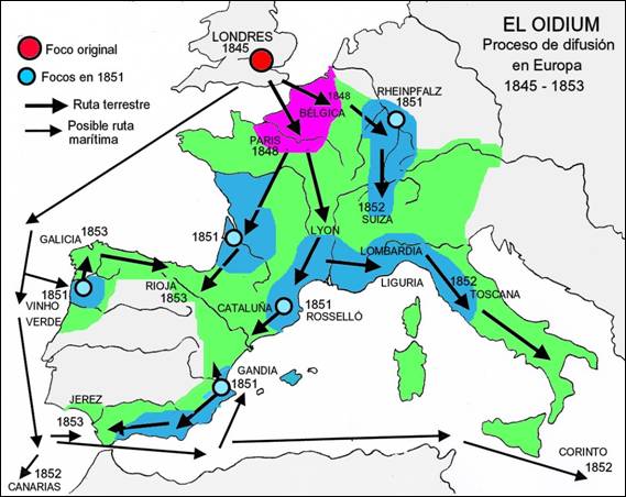 En 1848 aparecía a este lado del Canal de la Mancha, en algunas zonas de Bélgica y en los alrededores de París, en las viñas que la familia Rotschild tenía en Suresnes, en el jardín botánico real de Versalles y en algunos otros pueblos de la región. A partir de 1850 el oidium se propagó con extraordinaria rapidez por toda Europa, hasta el punto de que en 1852 ya fueron detectados focos infectados en casi todas la regiones vitícolas de Francia y de Alemania, así como en Suiza, en Italia (Lombardía y Toscana), Grecia (Corinto), Portugal y España (Cataluña, Valencia) e incluso en las lejanas islas Canarias (figura5). Los dos países donde mejor se conoce su evolución son Francia y Alemania, ya que de Italia, Grecia y Portugal apenas se han publicado estudios.