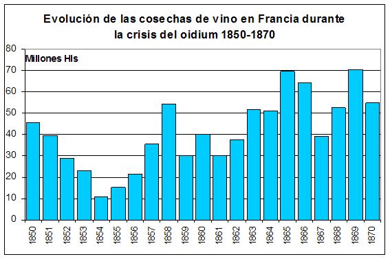 La disminución de las cosechas, sobre todo en Francia, donde cayeron de 45 millones de hectolitros en 1850 a sólo 11 millones en 1854, provocó una espectacular subida de las importaciones francesas de vino español y de los precios del vino, de lo que se aprovecharon algunas zonas vinícolas de España, como Cataluña, Valencia, Rioja y Baleares, a pesar de que también en ellas hizo sus estragos la citada plaga.