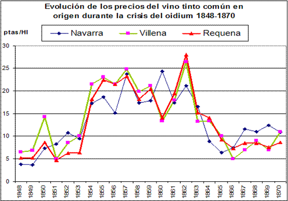 La crisis de producción a escala internacional tuvo como primera consecuencia un alza de los precios del vino que en el caso de España se multiplicaron por tres y hasta por cuatro en las principales regiones productoras de vinos tintos más demandados por el comercio francés, es decir en Cataluña, Valencia y Rioja-Navarra. Entre 1854 y 1862 la cotización de los vinos tintos se mantuvo en niveles jamás alcanzados hasta entonces, enriqueció a muchos viticultores y provocó una auténtica fiebre de nuevas plantaciones. La gran similitud en la evolución de los precios seguidos en Navarra (Lana, 1997) comparados con los de Requena y Villena (Piqueras, 1981) demuestra que el mercado del vino funcionaba a gran escala. Las pequeñas diferencias a favor de los vinos de Villena se deben a que la mayor graduación y color de la variedad monastrell, frente a la bobal de Requena y la garnacha de Navarra. No olvidemos que los franceses buscaban estos vinos para dar remontar y dar color a los suyos, cuando no les añadían agua (figura 8).