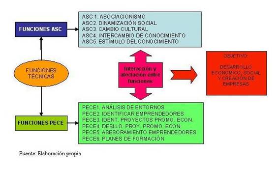 Dentro de las funciones propias del agente de desarrollo local, conforme a la normativa, cabe distinguir dos grupos claramente diferenciadas. Por un lado, se recogen las funciones de promoción de empleo y creación de empresas (PECE) que pretenden el análisis del entorno, con el fin de detectar oportunidades y/o amenazas en el mismo con una visión amplia, es decir, con la finalidad de trasladar esa información a otros decisores técnicos, a emprendedores para el desarrollo de iniciativas empresariales o bien, a otros actores del entorno cuya información les facilite su actividad empresarial o social, así como detectar necesidades formativas. Y por otro lado, se consideran las funciones de animación socio cultural (ASC), siendo estas últimas, objeto de estudio en este trabajo. Estas funciones técnicas de animación sociocultural tienen como fin estimular el conocimiento, utilización y desarrollo del potencial de desarrollo local, con la intención de promover y facilitar el asociacionismo local, la autoorganización y la dinamización y el cambio cultural, así como promover el intercambio de experiencias e iniciativas, con la intención de crear un clima que favorezca el desarrollo local y el desarrollo de sus proyectos, además de actuar como un mecanismo de conexión entre la Administración y las instituciones públicas y los emprendedores o demás actores sociales que estén implicados en el desarrollo de algún proyecto y desean su puesta en marcha[21].