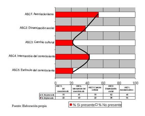 Asociacionismo (ASC1). La intención de esta función es promover asociaciones en el territorio, ya sean de empresarios, jóvenes, amas de casa o de cualquier otra índole que facilite la interacción social. Para llevar a cabo esta función se requiere tener un conocimiento amplio sobre la estructura social del municipio y la estructura política y económica, ya que de esta manera se pueden identificar los colectivos que precisen de un proceso asociativo que permita la identificación de éste con el territorio y con los recursos que posee. Es una de las vías que sirven para el intercambio del conocimiento y, en su necesidad, incidir en el cambio cultural y en la dinamización social. Para considerar que esta función esta presente se debe valorar el conocimiento que tiene el agente sobre la estructura social de su territorio, es decir, como se distribuye la sociedad por sexos y edades, además de identificar colectivos con necesidades especiales, ya sean económicas, culturales, deportivas o de integración, así como evaluar si desarrollan algún tipo de iniciativa tendente a actuar en alguno de estas sentidos.