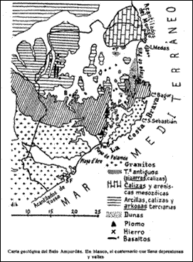 El Ampurdán, tanto el Alto como el Bajo, no son otra cosa que dos fajas de territorio transferido de las montañas y cordilleras del Pirineo, arrancadas grano a grano por cuatro ríos: la Muga, el Fluviá, el Ter y el Daró, con sus afluentes, los cuales han ido sedimentando, rellenando, en el curso de miríadas de años un gran golfo que se extendía desde el pie de San Pere de Roda hasta el cabo de Begur, pasando por debajo el Puig Neulós, bordeando la Muntanyeta, siguiendo hacia Lladó, Navata Bessalú, Banyoles, las inmediaciones de Girona, la base de la loma de les Gavarres, por el Bisbal, acercándose hacia Palafruguell y Palamós, donde terminaba el golfo para situarse en contacto con el litoral de San Feliu, etc.