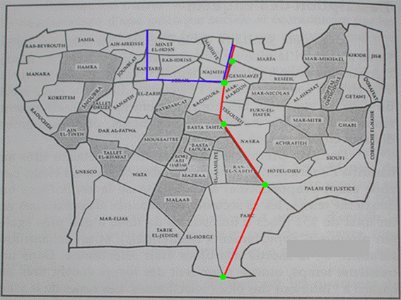 Figura 1. Ubicación de los puntos de paso entre Beirut Oeste y Beirut Este. En este mapa se presentan los distritos del Beirut administrativo. En rojo se ha trazado el recorrido de la línea de demarcación entre las zonas Oeste y Este. La extensión aproximada del antiguo centro comercial, auténtico no man´s land en la época que nos ocupa, queda marcada en azul. En verde aparecen señalados los cinco puntos de paso de la capital, a saber, de Norte a Sur, el del Puerto, el del Ring Fuad Shehab, el de Sodeco, el del Museo – Barbir y el de Tayyuneh. Los dos restantes, el de Galerías Sem`an y el que se abrió en el periodo, el de Kafa´at, quedaban ubicados varios kilómetros al Sur, en la periferia. Fuente: Zurayk, 1985; p.30. |